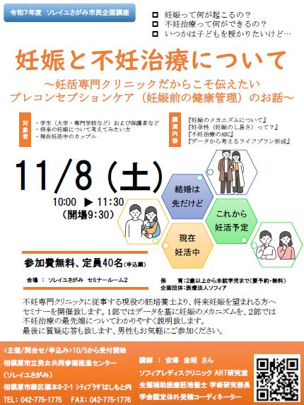 相模原市立男女共同参画推進センター(ソレイユさがみ)にて、当院培養士の安澤が企画講座に登壇します。一般の方向けに”妊娠と不妊治療について”をテーマにお話を致します。対象の方であればどなたでもご参加できますので、詳細は下記または広報誌を参照ください。
