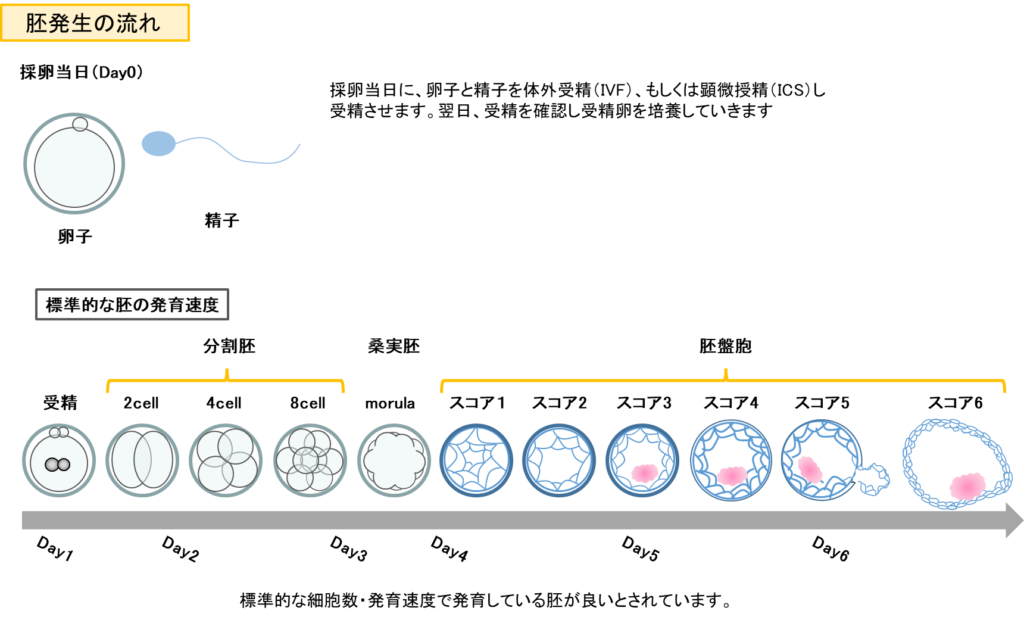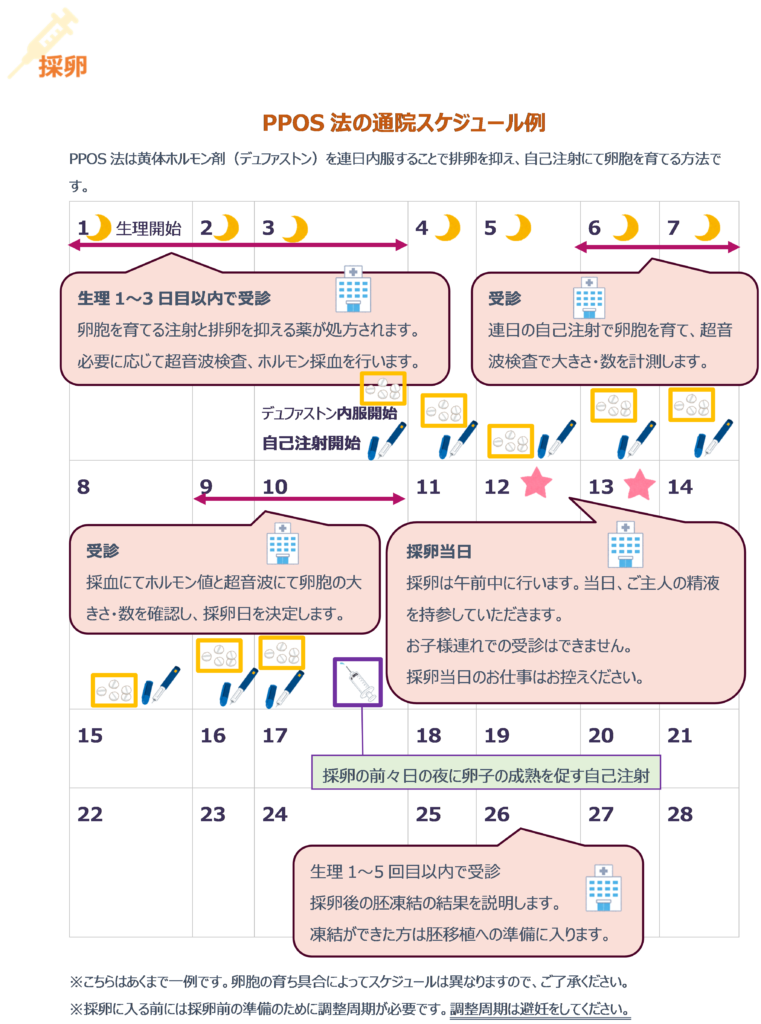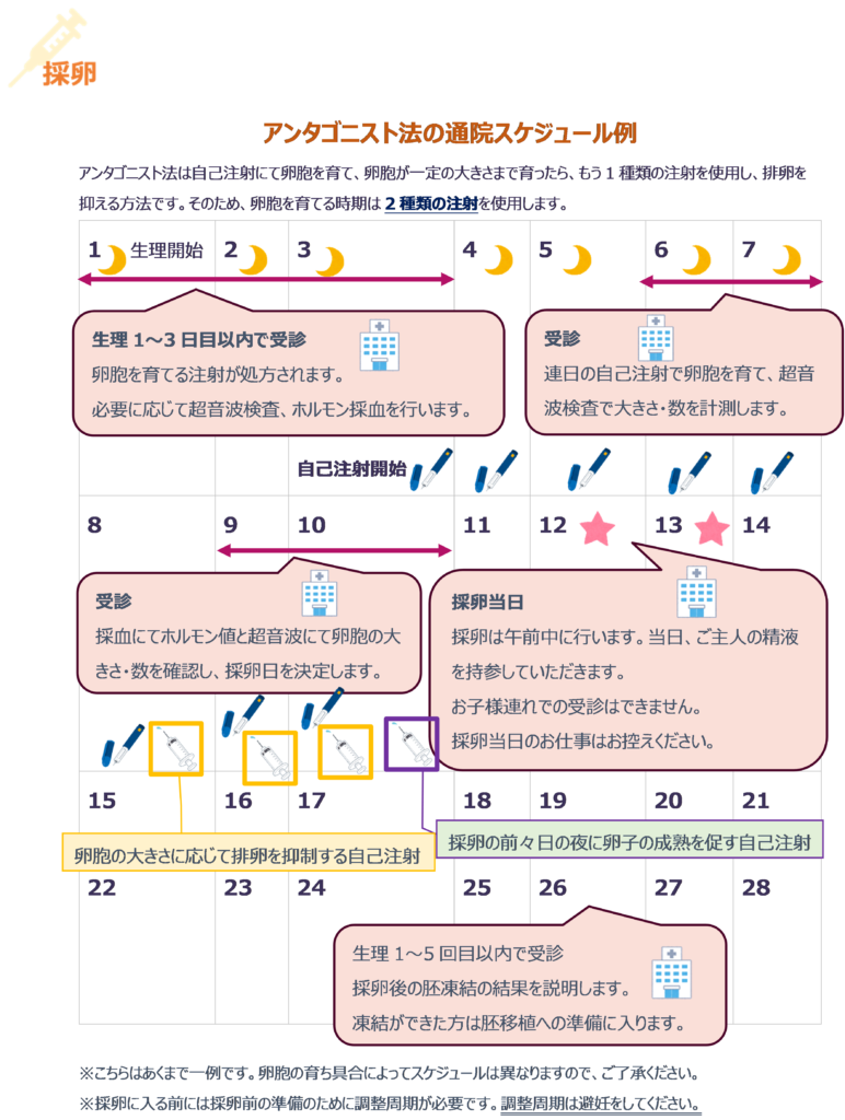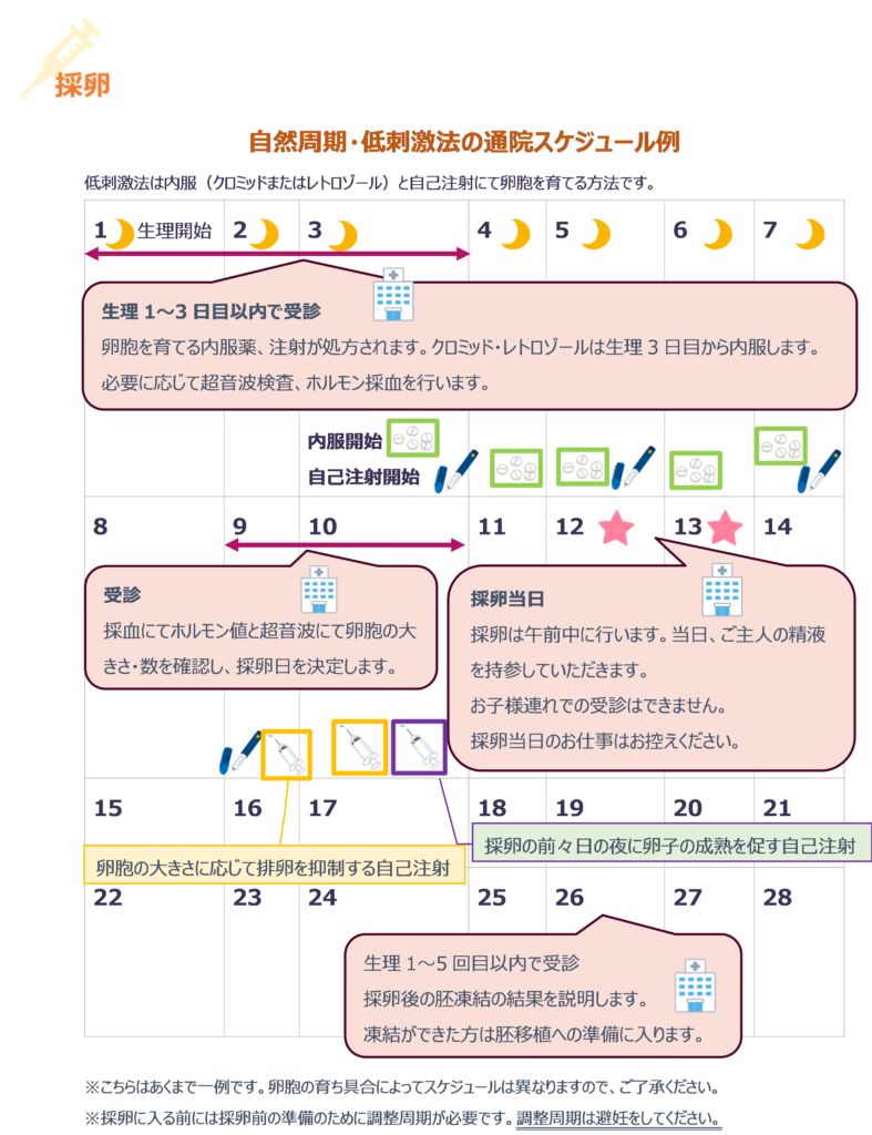 こちらはあくまで一例となります。刺激方法(高刺激法、低刺激法)、卵胞の育ち具合によってスケジュールは異なりますので、ご了承ください。