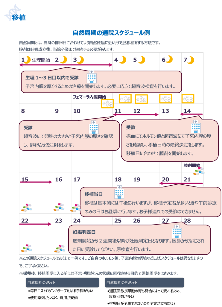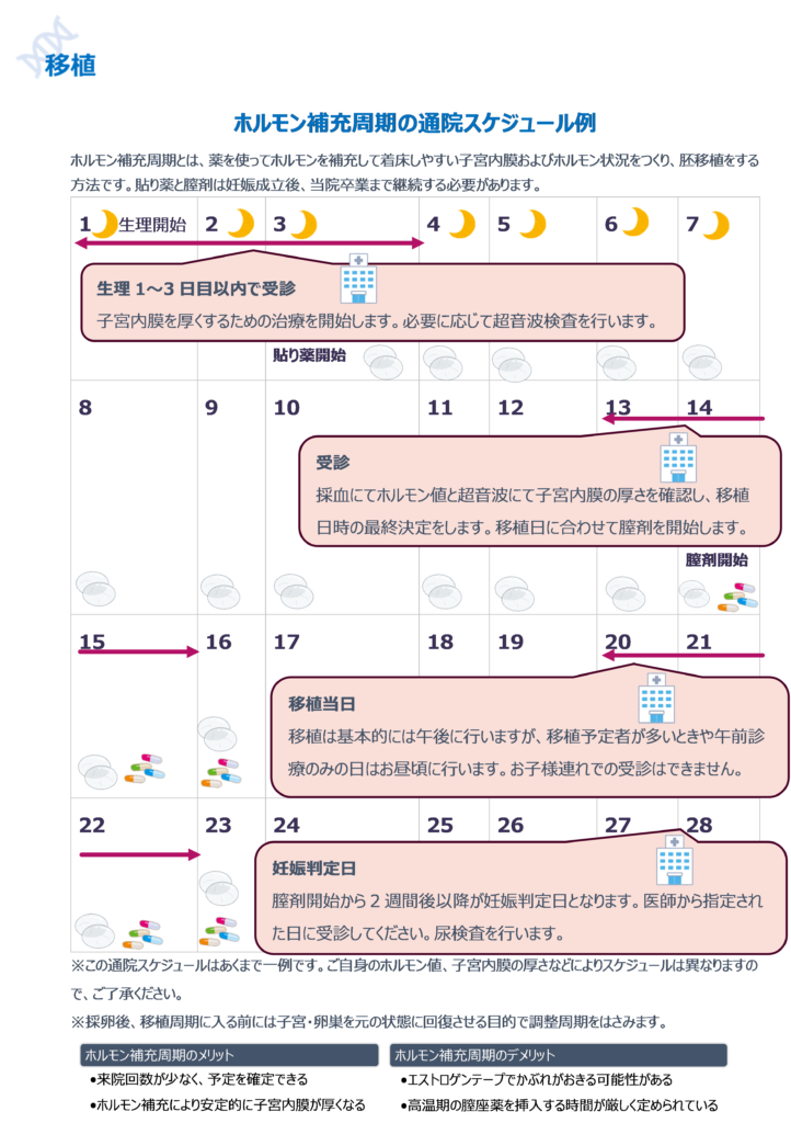 こちらはあくまで一例となります。移植周期の方法(ホルモン補充周期、自然周期)、ご自身の排卵日やホルモン値、子宮内膜の厚さによってスケジュールは異なりますので、ご了承ください。