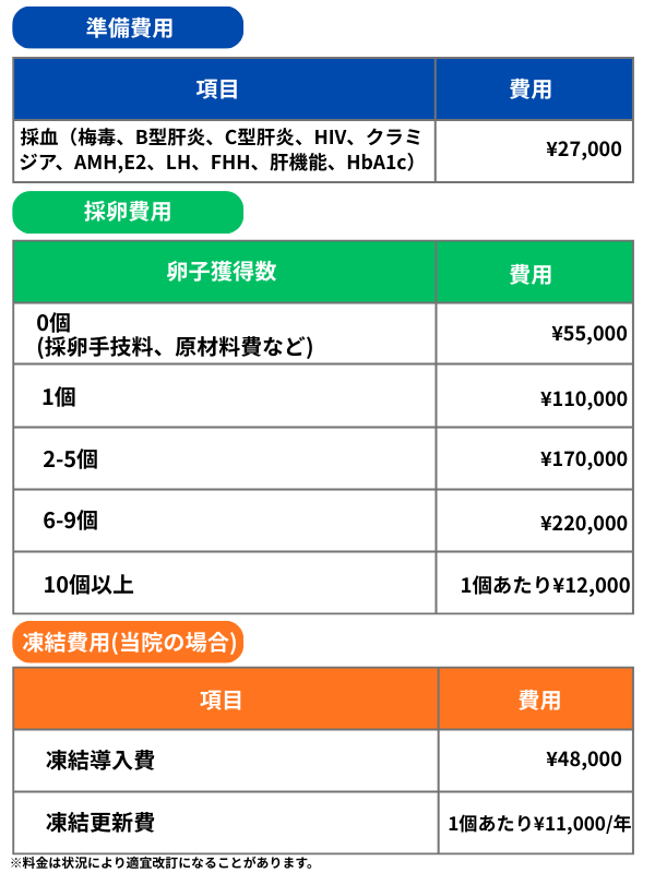 採卵・凍結費用に加え、保管料(年間)がかかります。これらは原則自費診療となります。