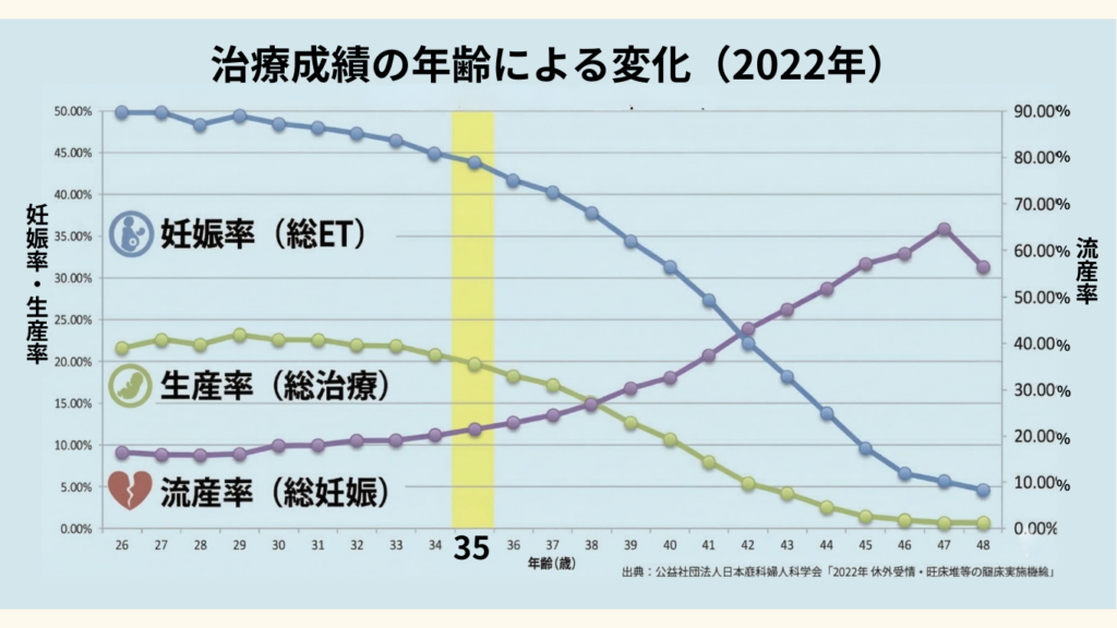 特に35歳前後を境に、自然妊娠する確率や、体外受精などの治療を受けて赤ちゃんが無事に生まれる確率が顕著に低下していくことがデータでも示されています。