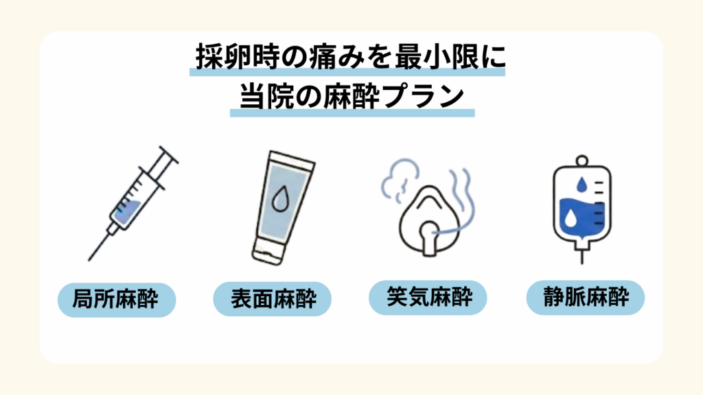 「採卵時の痛み」は、多くの方が不安に感じるポイントです。当院では、その不安を少しでも和らげ、リラックスして治療を受けていただけるよう、痛みを最小限に抑えるためのさまざまな麻酔方法をご用意しています。