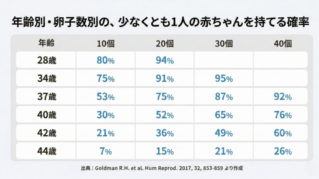 〈4.卵子凍結のデメリット「年齢別・卵子数別の、少なくとも1人の赤ちゃんを持てる確率」〉