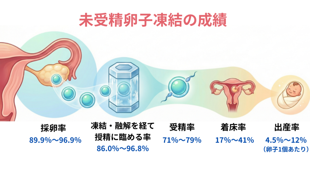 この図が示すように、未受精の卵子凍結から赤ちゃんの誕生までに至る確率は、4.5〜12%と報告されています。現在の医療技術では、妊娠の成立や赤ちゃんを得るところまでたどり着く可能性は、それほど高くありません。